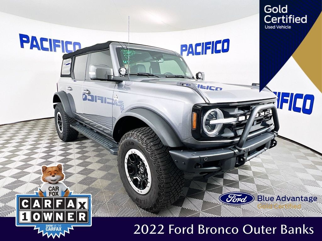 Adventure in style with this 2022 Ford Bronco Outer Banks Advanced 4-Door 4x4, finished in Carbonized Gray Metallic with Gray/Navy Leather-Trimmed Vinyl Seats. With just 14,049 miles, this CARFAX 1-Owner SUV offers premium comfort and serious off-road capability thanks to the sought-after Sasquatch Package.