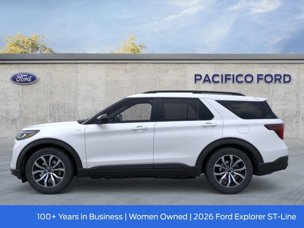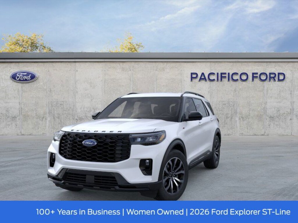 Pacifico Ford is proud to present you with another great new Ford. This 2026 Ford Explorer ST-Line is loaded with the following Factory Options:Equipment Group 300A Standard Package (Heated Unique Cloth Captain's Chairs, Radio: B&O Sound System by Bang and Olufsen, and Wheels: 20" Ebony-Painted Machined Aluminum), 4WD, 10 Speakers, 2nd Row Captain's Chairs w/E-Z Entry and Armrest, 3rd row seats: bench, 4-Wheel Disc Brakes, ABS brakes, Air Conditioning, Alloy wheels, AM/FM radio: SiriusXM with 360L, Apple CarPlay/Android Auto, Auto High-beam Headlights, Automatic temperature control, Brake assist, Bumpers: body-color, Compass, Delay-off headlights, Driver door bin, Driver vanity mirror, Dual front impact airbags, Dual front side impact airbags, Electronic Stability Control, Emergency communication system: 911 Assist, Exterior Parking Camera Rear, Four wheel independent suspension, Front and 2nd Rows Floor Liners with Carper Floor Mats, Front anti-roll bar, Front Bucket Seats, Front Center Armrest, Front dual zone A/C, Front fog lights, Front reading lights, Fully automatic headlights, Garage door transmitter, Heated door mirrors, Heated front seats, Heated steering wheel, Illuminated entry, Knee airbag, Leather steering wheel, Low tire pressure warning, Navigation System, Occupant sensing airbag, Outside temperature display, Overhead airbag, Overhead console, Panic alarm, Panoramic Fixed Glass Roof with Power Shade, Passenger door bin, Passenger vanity mirror, Power door mirrors, Power driver seat, Power Liftgate, Power passenger seat, Power steering, Power windows, Rear air conditioning, Rear anti-roll bar, Rear reading lights, Rear window defroster, Rear window wiper, Remote keyless entry, Security system, Speed control, Speed-sensing steering, Speed-Sensitive Wipers, Split folding rear seat, Spoiler, Steering wheel mounted audio controls, Tachometer, Telescoping steering wheel, Tilt steering wheel, Traction control, Trip computer, and Variably intermittent wipers. Recent Arrival!