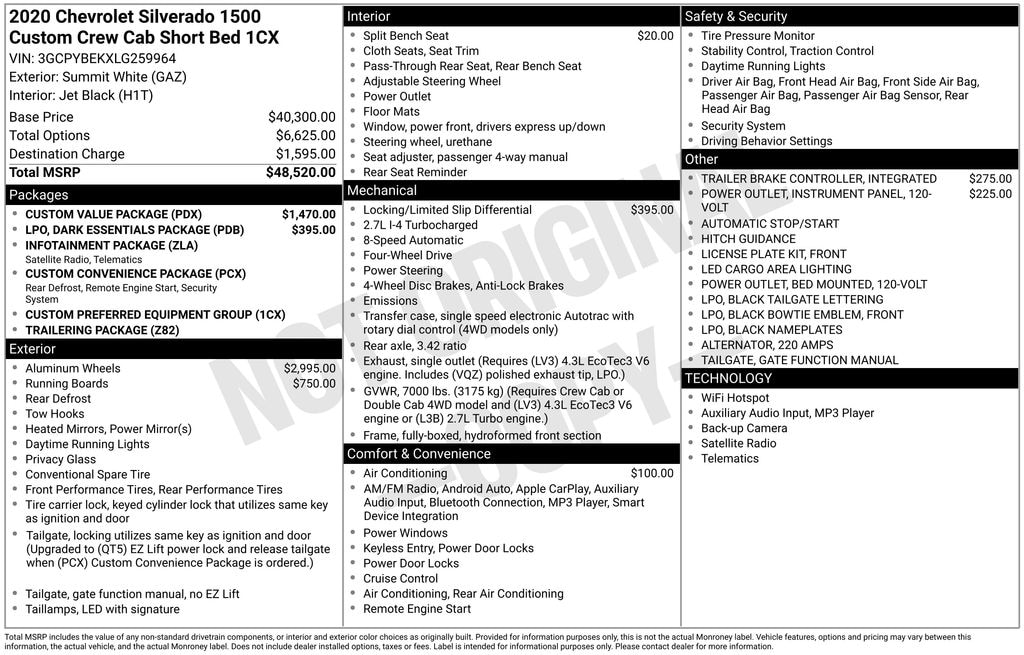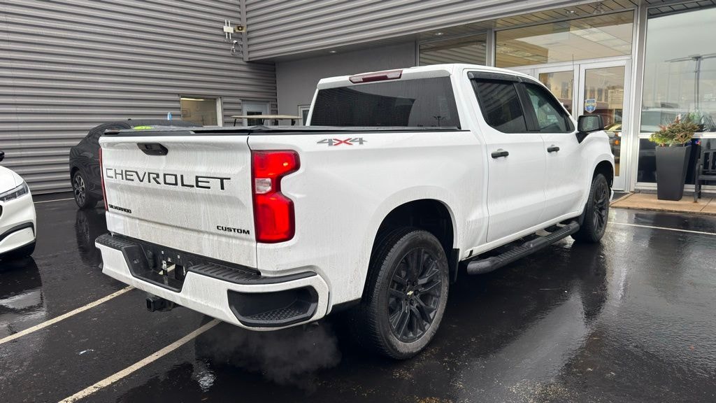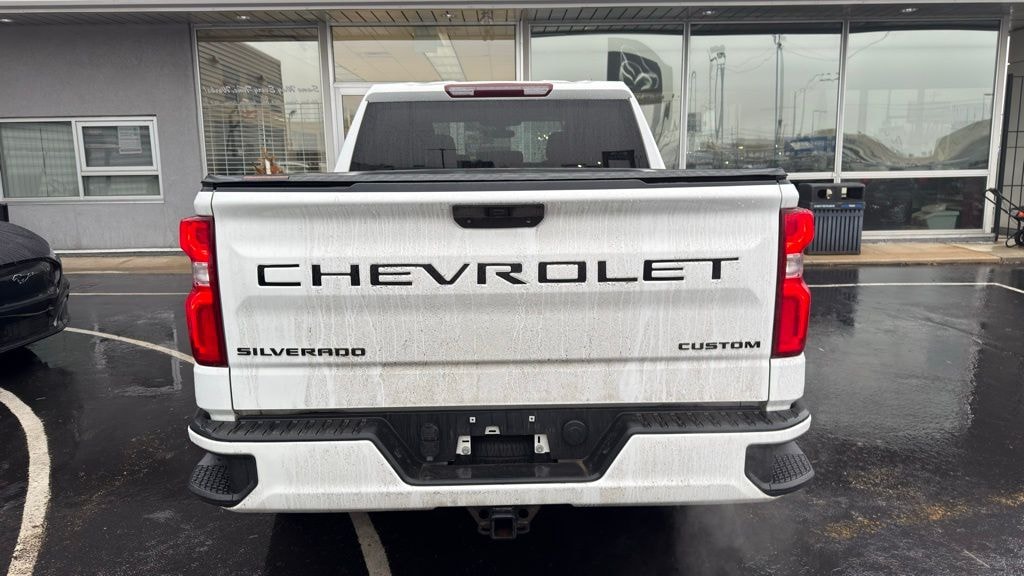 This pre-owned 2020 Silverado 1500 Custom 4WD Crew Cab delivers turbocharged performance, bold blacked-out styling, and serious towing capability in classic Summit White with Jet Black interior.