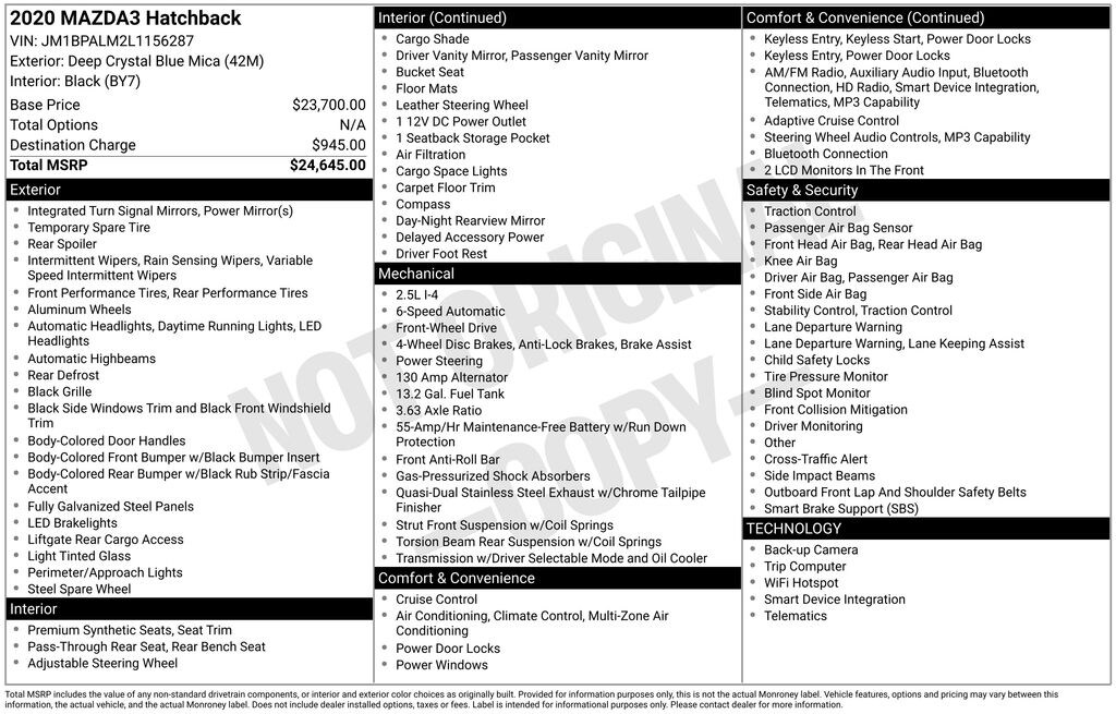 ### **2020 Mazda3 Hatchback â" 61,206 Miles â" Deep Crystal Blue Mica â" One Owner â" Clean CARFAX**